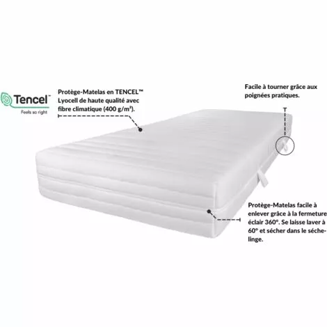 La housse résistante en TENCEL Lyocell de haute qualité avec fibre climatique matelassée (400 g/m²) régule l’humidité et la température pour un excellent climat de sommeil. Le TENCEL Lyocell est produit de manière totalement écologique et peut être lavé et séché à 60 degrés.