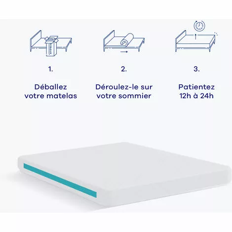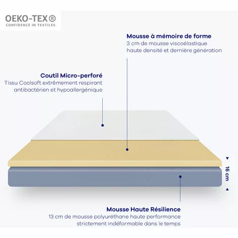 Garnissage : 3 cm de mousse mémoire de forme haute densité. 13 cm de mousse polyuréthane haute performance. Coutil micro-perforé en tissu coolsoft respirant. Bande latérale pour une aération optimale.