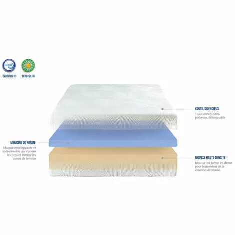 Ce matelas Mirage pour un couchage de 90×200 cm est un matelas à mémoire de forme. C’est un matelas en mousse de 25 cm composé de 17,5 cm de mousse Haute Densité de 33 kg/m³ + 6,5 cm de mousse viscoélastique à mémoire de forme de 60 kg/m³.Technologie: Mousse Mémoire de formeCouchage: 90×200 cmÉpaisseur: 25 cmCouleur: Blanc Accueil: EnveloppantSoutien: FermeDéhoussable: OuiAme:17,5 cm de mousse Haute Densité de 33 kg/m³ + 6,5 cm de mousse à mémoire de forme de 60 kg/m³Coutil: Tissu stretch 100 % PES de 300 gr/m² – Face sommier antidérapanteEntretien: Housse amovible (zip 4 côtés) et lavable en machine à 40°CCertification A.F.N.O.R. OuiCertification OEKO-TEX® OuiCertification CertiPUR Oui Ce matelas garanti 10 ans est fabriqué en France et respecte ainsi les normes et législations en vigueur.Nous ne livrons pas en Corse.