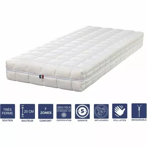 Plate-bande: Tissu Hyper RESPIRANT matelassé avec de la ouate polyester åme noyau : bloc de 15 cm de Mousse HAUTE RESILIENCE Poli Lattex derniére génération Indéformable La structure du matelas est divisée en 7 incroyables zones de confort qui s’adaptent à tous types de morphologies et aident à libérer les tensions musculaires pour soulager les maux de dos provoqués par de mauvaises postures au cours de la journée