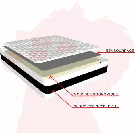 Le matelas est multicouche, combinaison de mémoire de forme et mousse ergonomique 25 kg/m3. La mousse ergonomique de polyuréthane peut être utilisée pour produire la structure interne (également appelée “solide”) d’un matelas simple, ou elle peut être la base de support pour les matelas avec une ou plusieurs couches. La principale caractéristique des matelas fabriqués avec des mousses de polyuréthane est leur capacité à faire face à différents types de pression sans subir de déformations majeures. L’élasticité et la résilience qui les distinguent leur permettent de reprendre leur forme initiale malgré la forte fatigue subie.
