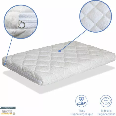Mousse de dernière génération avec micro forage qui garantit une bonne ventilation en éliminant la chaleur et l’humidité. La mousse esd d’une densité suffisante pour s’adapter au corps du bébé et pour éliminer les zones de pression en réduisant l’agitation nocturne. Prévient le risque de plagiocéphalie offrant un repos plus sûr et plus sain.