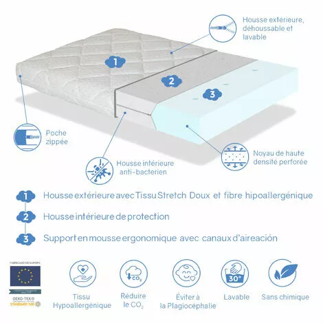 Matelas déhoussable. Il a deux housses. La housse extérieure est faite de tissu Stretch doux et élastique sur la face supérieure. Cette housse extérieure est rembourrée avec fibres hetpoallergénique qui combattent naturellement la prolifération des allergies et aident à protéger le repos de notre bébé. La face inférieure est formée de tissu 3D hautement respirant qui aide à dissiper la chaleur. En outre, il dispose d’une housse intérieure en tissu de protection multi-élastique qui facilite le retrait de la housse.