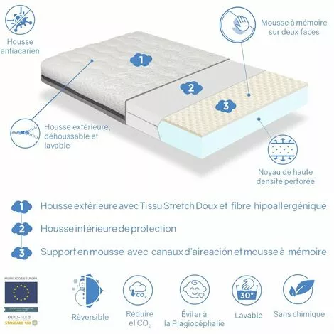 Matelas déhoussable. Il a deux housses. La housse extérieure est faite de tissu Stretch doux et élastique sur la face supérieure. Cette housse extérieure est rembourrée avec fibres hetpoallergénique qui combattent naturellement la prolifération des allergies et aident à protéger le repos de notre bébé. La face inférieure est formée de tissu 3D hautement respirant qui contribue à réduire la chaleur et l’accumulation de CO2. En outre, il dispose d’une housse intérieure en tissu de protection multi-élastique qui facilite le retrait de la housse.