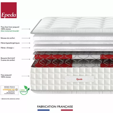 Le matelas Deluxe est composé de la technologie Epeda Multi-actif. Il s’agit d’une technologie hybride qui allie amortisseurs zonés et suspension ressorts. Cette technologie permet d’absorber les vibrations liées aux mouvements des dormeurs, elle permet également de garantir l’indéformabilité du matelas dans le temps et garantit une aération optimale. Le matelas est travaillé en 5 zones de confort pour un soutien adapté à la morphologie de chacun.