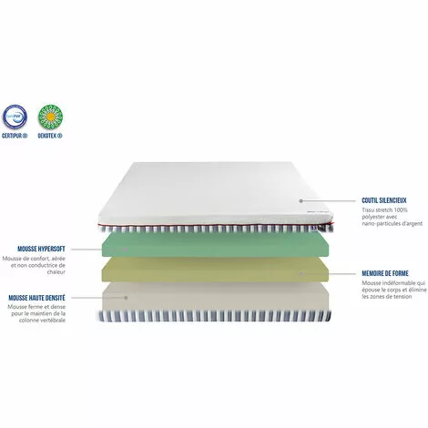 - Âme intérieure du matelas (certifiée CertiPUR) : 13 cm de mousse Haute Densité de 40 kg/m³ + 6 cm de mousse à mémoire de forme de 50 kg/m³ + 6 cm de mousse Hypersoft Haute Résilience de 55 kg/m³