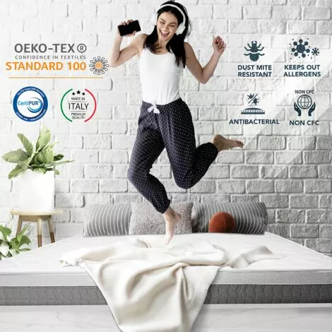 QUALITÉ CERTIFIÉE. Matelas 100% Made in Italy, avec les certifications OEKO TEX Standard 100, CertiPUR et marquage CE.