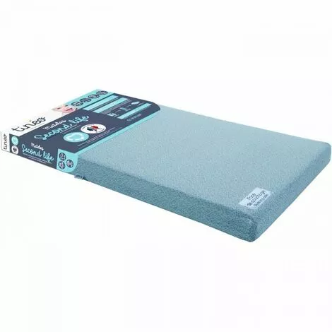 Matelas composé d’un bloc de fibres recyclées 20kg/m3. Coutil en tissu Second Life / matiere polyester issue du recyclage des polyéthylenes qui une fois triés sont transformés en fil de polyester.